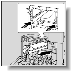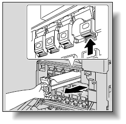 本機の前ドアを開けて、使い終わったトナーカートリッジのロックヅメを押し上げ、ロックを解除します。トナーカートリッジが止まる位置まで手前に引いてから上に持上げて引き抜いてください。