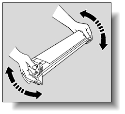 新しいトナーカートリッジを用意します。新しいトナーカートリッジは中のトナーが固まっていることがありますので、両端を手で持って上下に5 ~10回程度よく振ってください。