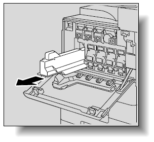 本機の前ドアを開けて、廃棄トナーボックスを持上げて取り外します。続いて新しい廃棄トナーボックスを取り付け、前ドアを閉じてください。