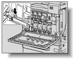 本機の前ドアを開き、【主電源スイッチ】をOFF にし、廃棄トナーボックス解除レバーを押します。