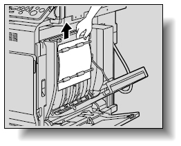 本機の両面ユニットドアを開き、用紙をゆっくり引き抜いてください。