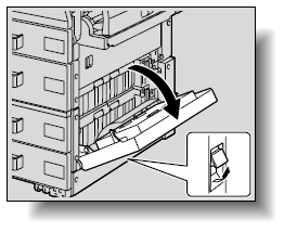 本機の右下ドア解除レバーを引き、右下ドアを開いて用紙をゆっくり引き抜いてください。