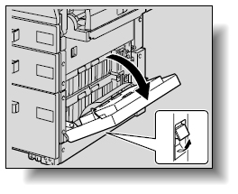 本機の右下ドア解除レバーを引き、右下ドアを開いて用紙をゆっくり引き抜いてください。