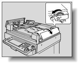 次に、ADF右側の紙づまり処理ガイドを開きます。ダイアルを反時計方向に回して、原稿を送り出し、ゆっくり引き抜いてください。