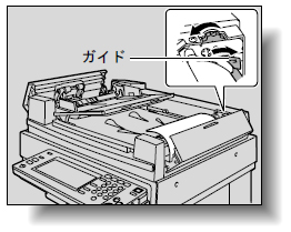 本機の自動原稿送り装置(ADF)左側の紙づまリ処理ガイドを開き、原稿給紙トレイの原稿をゆっくり引き抜いてください。