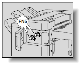 フィニッシャーの前ドアを開き、紙づまり処理ダイアル【FN5】を同時に時計方向に回します。