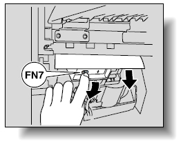 紙づまり処理レバー【FN7】を開きながら、用紙を引き抜いてください。