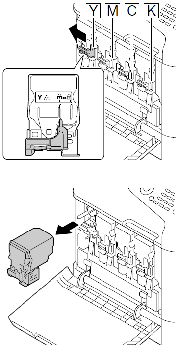 トナーカートリッジの交換手順は全色同じです。ここでは、イエロートナーカートリッジを例にしてご説明します。