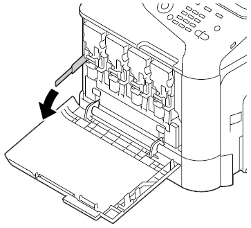操作パネルのメッセージウィンドウでなくなったトナーカートリッジの色を確認し、本機の前ドアを開けて正面のレバーを左へ引いてください。