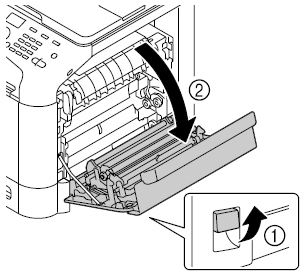 手差しトレイの用紙を取り除いた後、本機横にあるレバーを引き(1)、右ドアを開いて(2)詰まっている用紙を用紙を取り除き、右ドアを閉じます。右ドアを開閉するときは必ずトレイ1をたたんでください。