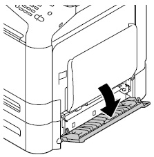 手差しトレイの用紙を取り除いた後、トレイ3 の右ドアを開いて詰まっている用紙を用紙を取り除き、右ドアを閉じます。右ドアを開けるときは、手差しトレイをたたんでから開けてください。