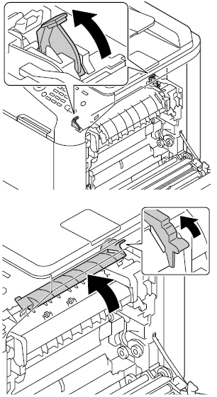 レバー(2箇所)を押し上げて定着カバーを開き、詰まっている用紙を取り除きます。下側に取り除くことができない場合は、定着ユニットの上側から取り除いてください。