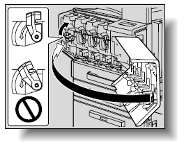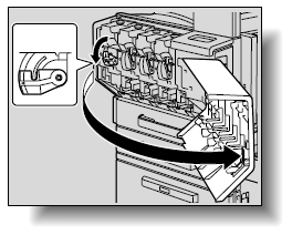 本機の前ドアを開き、交換したいトナー色のトナーカートリッジ固定レバーを反時計方向に倒してください。