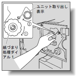 フィニッシャーの前ドアを開き、ユニット取り出し表示が全面青色になるように、紙づまり処理ダイアル1を時計方向に回します。