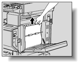 本機の両面ユニットドアを開き、用紙をゆっくり引き抜いてください。