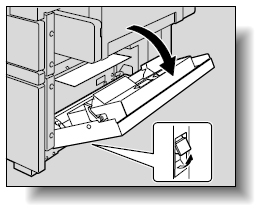 レバーを引いて大容量トレイ(LCT)の右ドアを開き、用紙をゆっくり引き抜いてください。
