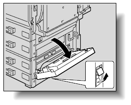 本機の右下ドア解除レバーを引きいて右下ドアを開き、詰まっている用紙をゆっくり引き抜いてください。