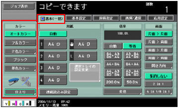 キーを押しますと、左エリアにカラー設定キーと仕上りキーを表示いたしますので、こちらから設定が行えます。