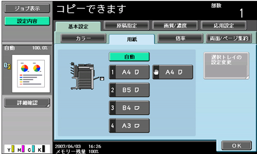 任意のトレイを選択し、[選択トレイの設定変更]を押して出力したい用紙の種類を選びます。