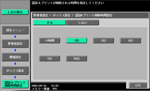 文書保持時間の設定を変更するには、【設定メニュー/カウンター】キーを押し、[管理者設定]→[環境設定]→[ボックス設定]→[認証& プリント削除時間設定]を押し設定を変更して下さい。