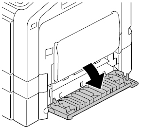 トレイ3/4の右ドアを開いて詰まっている用紙を用紙を取り除き、右ドアを閉じます。右ドアを開閉するときは必ずトレイ3/4をたたんでください。