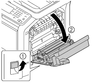 本機横にあるレバーを引き(1)、右ドアを開きます(2)。右ドアを開閉するときは必ずトレイ1 をたたんでください。