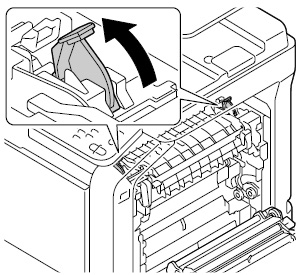 レバー(2箇所)を押し上げて定着カバーを開き、詰まっている用紙を取り除きます。下側に取り除くことができない場合は、定着ユニットの上側から取り除いてください。