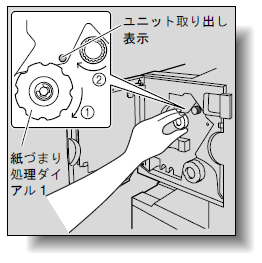フィニッシャーの前ドアを開き、ユニット取り出し表示が全面青色になるように、紙づまり処理ダイアル1を時計方向に回します。
