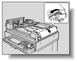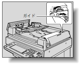 本機の自動原稿送り装置(ADF)左側の紙づまリ処理ガイドを開き、原稿給紙トレイの原稿をゆっくり引き抜いてください。