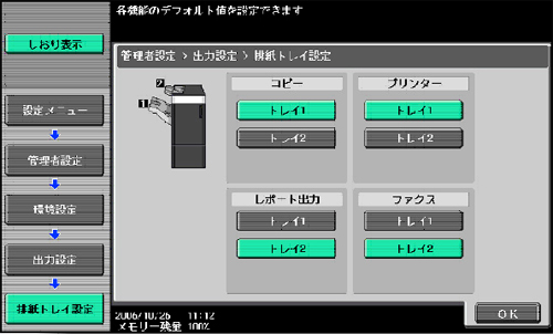 コピー・プリント・ファクスの優先排紙先は、「設定メニュー/カウンター」キーを押し、「管理者設定」→「環境設定」→「出力設定」→「排紙トレイ設定」で指定することが可能です。