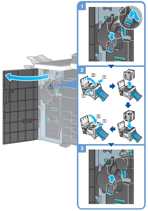 フィニッシャーの前ドアを開けて、下図の手順に従ってステープルカートリッジを交換してください。