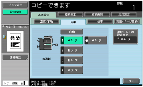 任意のトレイを選択し、[選択トレイの設定変更]を押して出力したい用紙の種類を選びます。