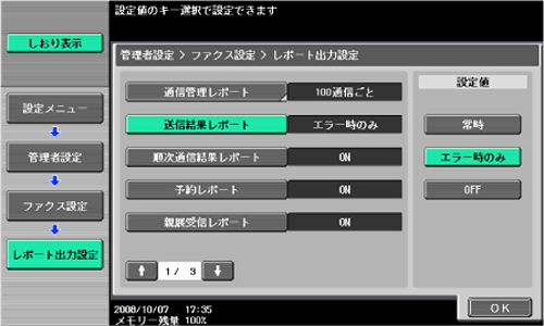 [常時]に設定すると通信ごとにレポートが出力され、[エラー時のみ]にするとエラー時にレポートが出力されます。また、OFFに設定すると、予約レポート類のすべてが出力されなくなります。