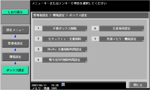 パネル上にある【設定メニュー/カウンター】を押し、[管理者設定]→[ボックス設定]で[外部メモリー設定]画面を開きます。スキャンデータを保存したい場合は[文書保存]をONにしてください。USBメモリー内のデータを印刷したい場合は[文書印刷]をONにしてください。