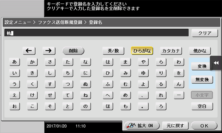 【メニュー】 → 【設定メニュー】 → 【宛先/ボックス登録】 → 【ファックス/スキャン宛先登録】 → 【短縮宛先(共有)