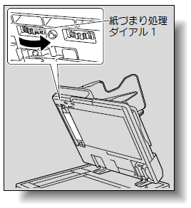 紙づまり処理ダイアル1を矢印方向に回して原稿を送り出して取り除きます。排紙トレイに原稿の先端が見えない場合は、開閉ガイドを開いて原稿の先端を出してから、紙づまり処理ダイアル1を回して原稿を送り出してください。