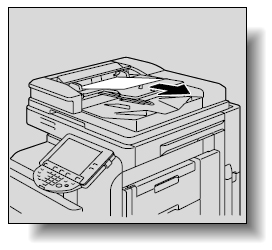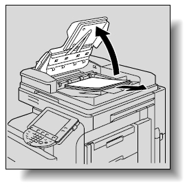 原稿送り装置(以下ADF)の原稿給紙トレイに残っている原稿を取り除いた後、左ドアを開け、原稿給紙トレイを止まる位置まで上げて詰まっている用紙を取り除いてください。