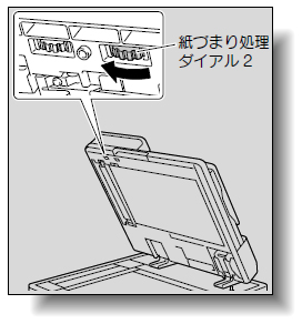 取り除けなかった場合は、ADF を開いて紙づまり処理ダイアル2を回し、原稿を原稿排紙トレイに送り出して取り除いてください。
