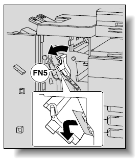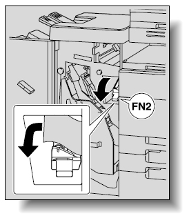 フィニッシャーの前ドアを開き、ガイドレバー【FN2】を下げて用紙を取り除いてください。ガイドレバー【FN2】を元の位置に戻します。