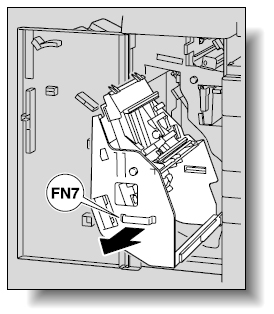 取っ手【FN7】を持って、スタッカーユニットを引き出します。スタッカーユニットにつまっている用紙を取り除いてください。用紙が取除けない場合は、紙づまり処理ダイアル【FN6】を回して用紙を送り出します。スタッカーユニットを元の位置に戻してください。