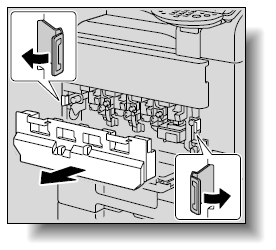 本機の前下ドアを開けて、廃棄トナーボックス固定レバーを外して、廃棄トナーボックスを取り外します。新しい廃棄トナーボックスを取り付け、本機の前下ドアを閉じます。