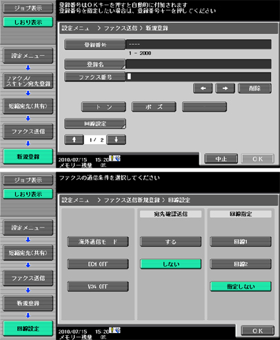 (2)短縮宛先登録時に、「回線設定」で[回線1]または[回線2]のどちらかを選択してください。