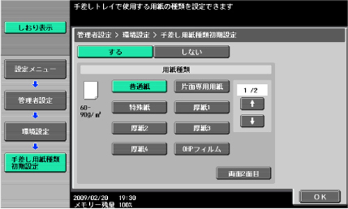 また、同じ画面内の[用紙種類]で、手差しトレイで使用する用紙種類の初期設定を変更できます。