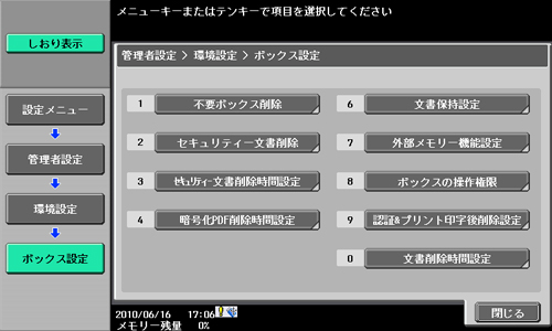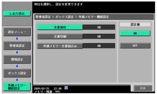 【設定メニュー/カウンター】を押し、[管理者設定]→[環境設定]→[ボックス設定]で[外部メモリー設定]画面を開きます。スキャンデータを保存したい場合は[文書保存]を「ON」にしてください。USBメモリー内のデータを印刷したい場合は[文書印刷]を「ON」にしてください。また、USBメモリー内のデータをボックスに保存したい場合は[外部文書読込み]を「ON」にしてください。