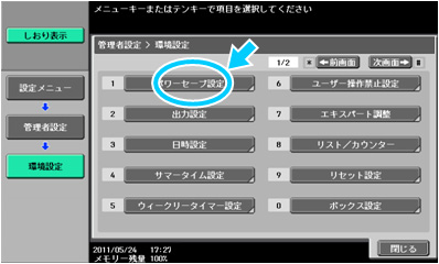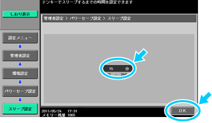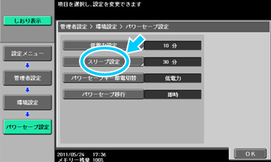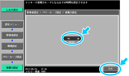 操作パネルの【設定メニュー/カウンター】を押し、[管理者設定]に入り[環境設定]-[パワーセーブ設定]の[低電力設定]および[スリープ設定]にてそれぞれの開始時間を設定します。