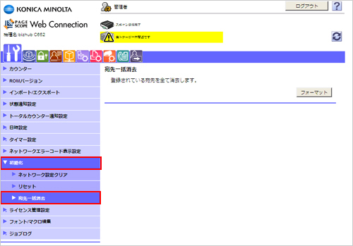 PageScope Web Connection の管理者設定画面を開き、「システムタブ」→「初期化」→「短縮宛先」で一括削除が可能です。