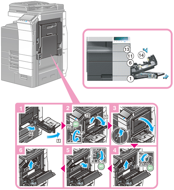 右ドア部を開けて、下図の手順に従って詰まった用紙を取り除いてください。