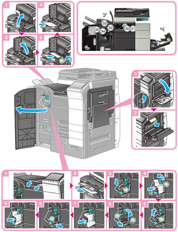 オプションのフィニッシャーFS-534に中綴じ機SD-511、パンチキットPK-520を装着している場合は、下図の手順で詰まった紙を取り除いてください。