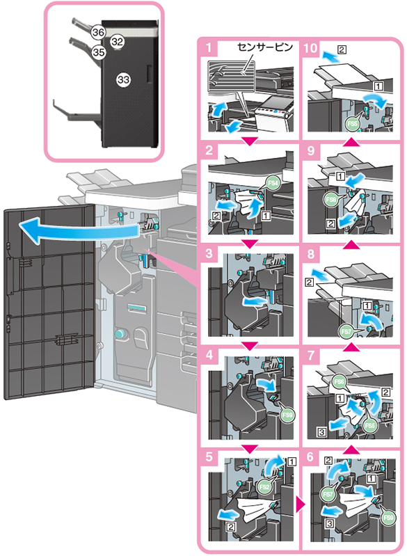 オプションのフィニッシャーFS-535に中綴じ機SD-512、パンチキットPK-521を装着している場合は、下図の手順で詰まった紙を取り除いてください。