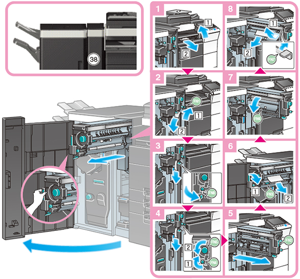 左ドア部を開け、下図の手順に従って詰まった用紙を取り除いてください。